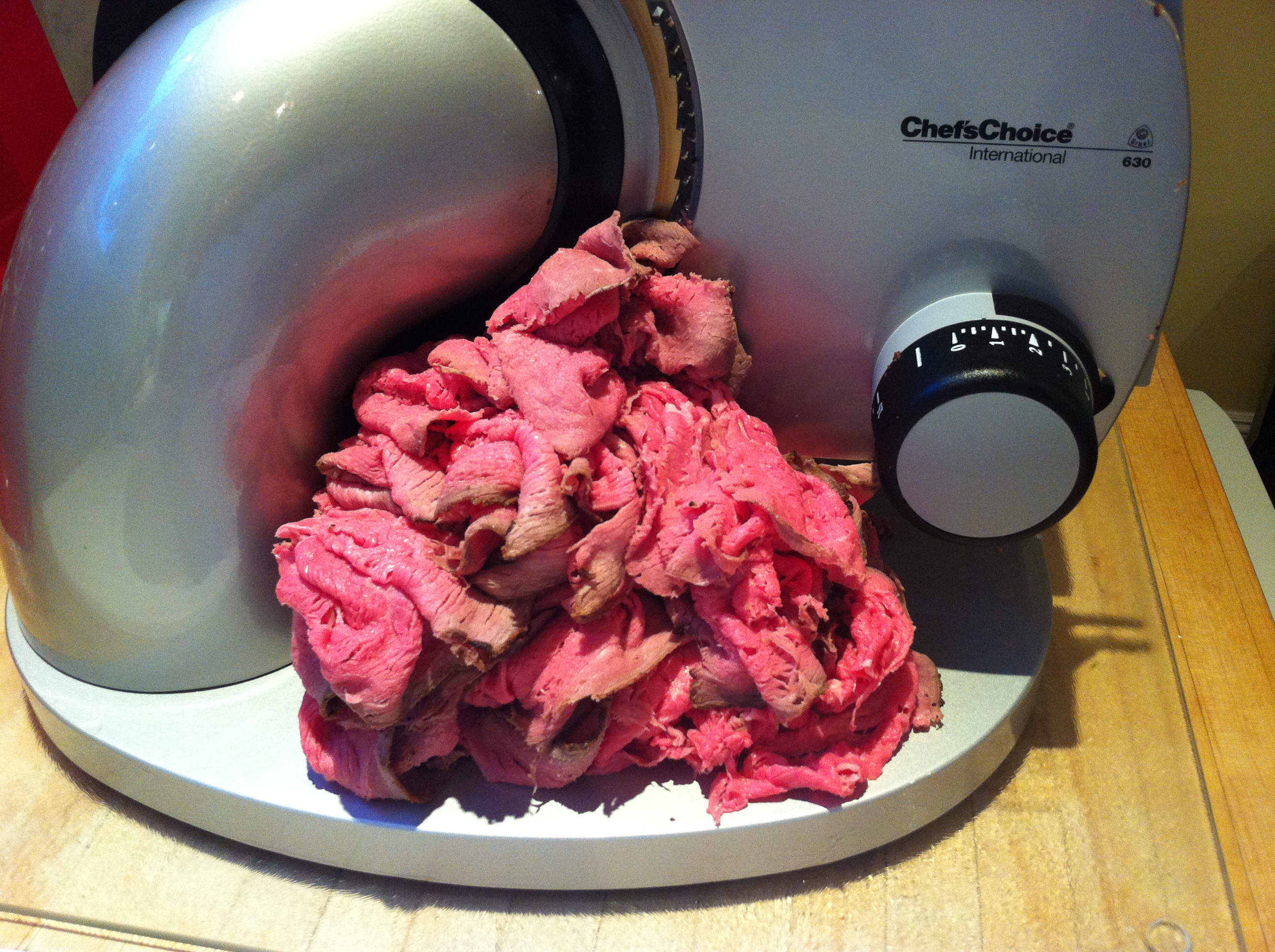 The left-over roast beef from last night’s dinner was sliced thin on the deli slicer…