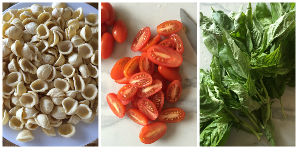 This dinner is at its most spectacular when tomatoes are hanging heavy on the vine, ripened by the intense summer sun and the basil patch grows faster and thicker by the hour in the afternoon heat. A crisp, cold glass of sauvignon blanc and a small garden basket accompanied me on my walk out to the garden that evening, hair still wet from a late afternoon swim. The heavy fruit, warm and tender, practically fell into my hand as soon as I touched the thick stems and the pungent scent of basil remained on my hands and wrists like a perfume after picking bushy stems for our dinner. Boiling water and a bit of chopping…little effort for a simple summer dinner that produces such splendid flavor.